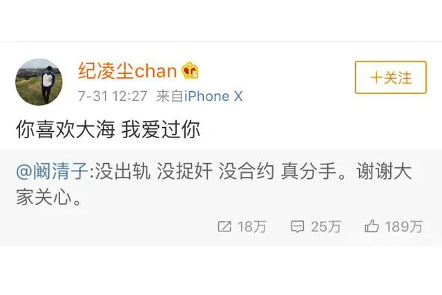 2018年7月31日中午,阚清子正式发微博官宣分手: