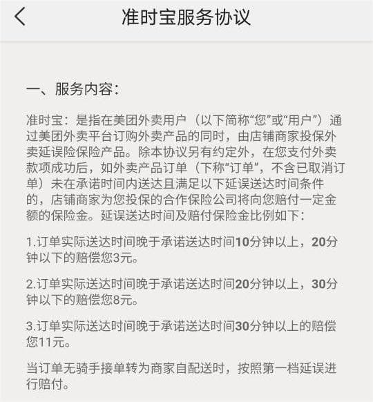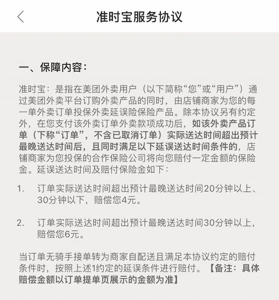 “准时宝”是美团外卖提供的一个外卖延误险服务,不过它的赔付规则好像是不固定的,目前见到的就有如下两种的类型: