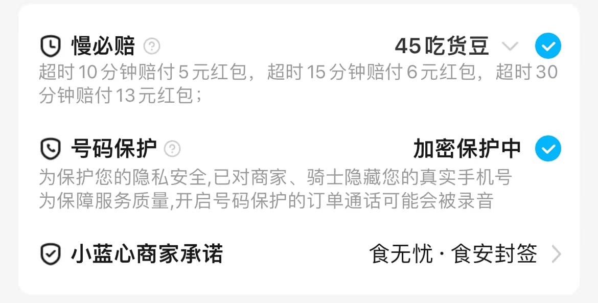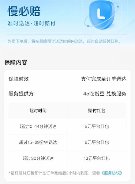 “饿了么”也有提供类似的服务,不过它不叫做“准时宝”,它叫做“慢必赔”: