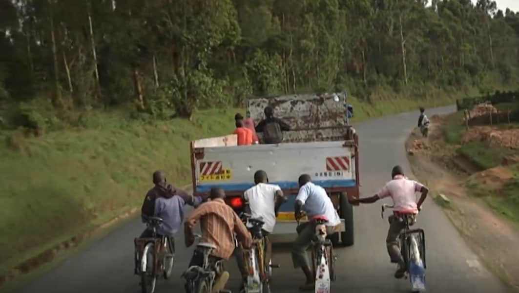 纪录片《天路布隆迪》截图:借助卡车来借力的自行车运输工们