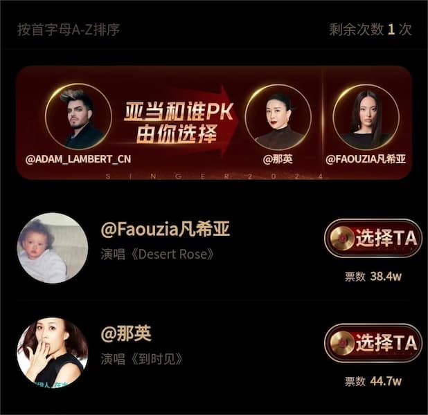 在节目直播的期间,@湖南卫视歌手 在微博上发起了一个“限时投票”的互动,该“限时投票”将会一直持续到第五位竞演歌手演唱完毕为止,到时候,凡希亚和那英之间,谁的票数高,谁就代表七位在线歌手迎战亚当·兰伯特。